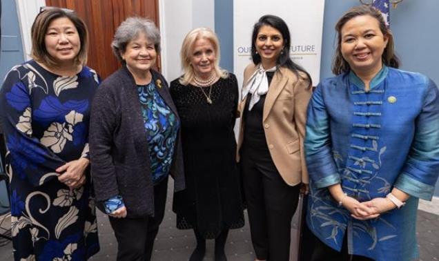 从左至右:孟昭文代表、Lois Frankel代表、Debbie Dingell代表、OSF副总裁Sahana Dharmapuri和Jill Tokuda代表。2024年2月,在Our Secure Future(OSF)举办的国会简报会上,她们齐聚一堂,共同探讨了“女性、和平与安全政策关于全球冲突相关性暴力的应对措施”这一重要议题 来源:Our Secure Future(2024年)