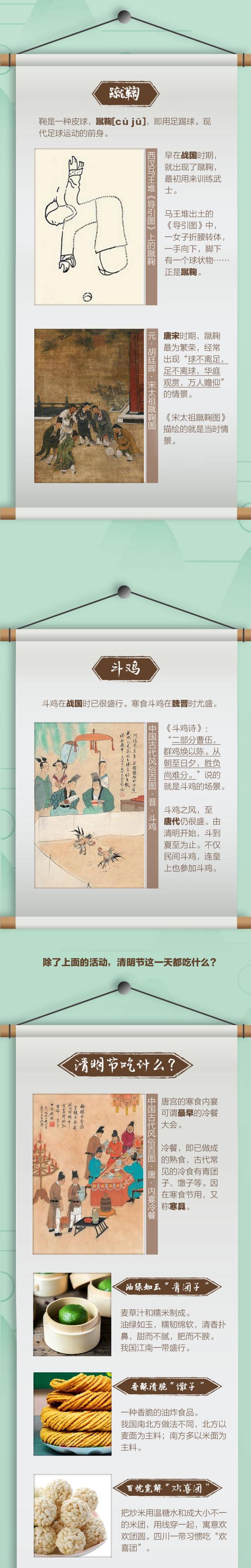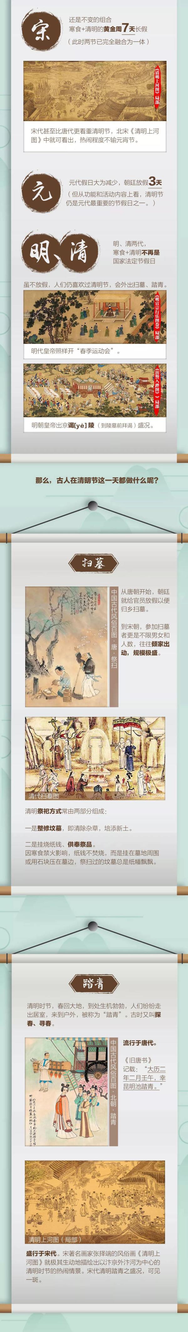 其实在古代,清明节除了有祭奠逝者的悲伤,还有万众踏青、郊游、戴柳、斗鸡等多种活动。那么,你可知道清明节是怎么来的?古人在清明节可有假期?他们是怎么过的?一图了解↓