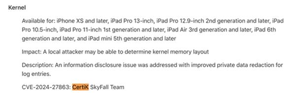 CVE-2024-27863:在iOS 17.6、iPadOS 17.6、macOS Sonoma 14.6以及watchOS 10.6系统中,发现了一个关于核心的漏洞,可能造成本地攻击者能够确定内核内存布局;现已通过改进日志条目的私有数据编辑来解决信息泄露问题。