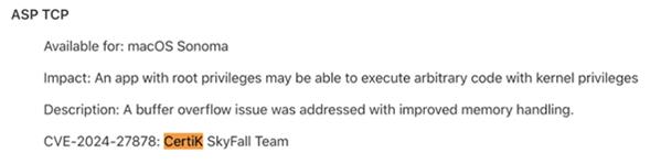 CVE-2024-27878:在macOS Sonoma 14.6系统中,发现了和ASP TCP相关的一个漏洞,该漏洞可以导致内核权限执行任意代码;已通过改进内存处理解决缓冲区溢出问题。