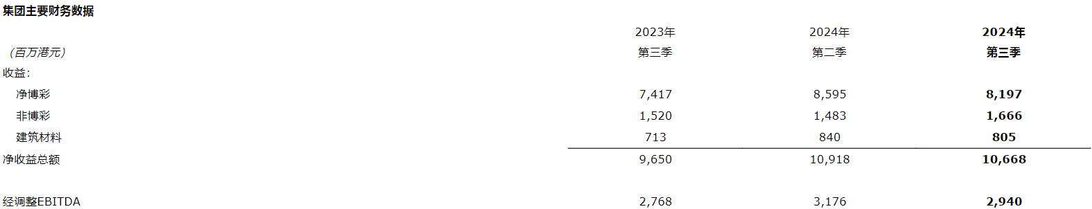 「今日我很高兴向大家报告集团于2024年第三季度之财务业绩。于2024年第三季度集团净收益按年上升11%至107亿元,经调整EBITDA按年上升6%至29亿元,其中因净赢率偏低导致经调整EBITDA减少约1.65亿元。