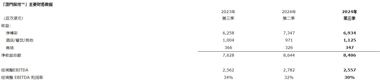 「澳門銀河™」为集团的主要收益及盈利贡献来源。于2024年第三季度,净收益为84亿元,按年上升10%,按季下跌3%。经调整EBITDA为26亿元,按年持平,按季下跌8%。