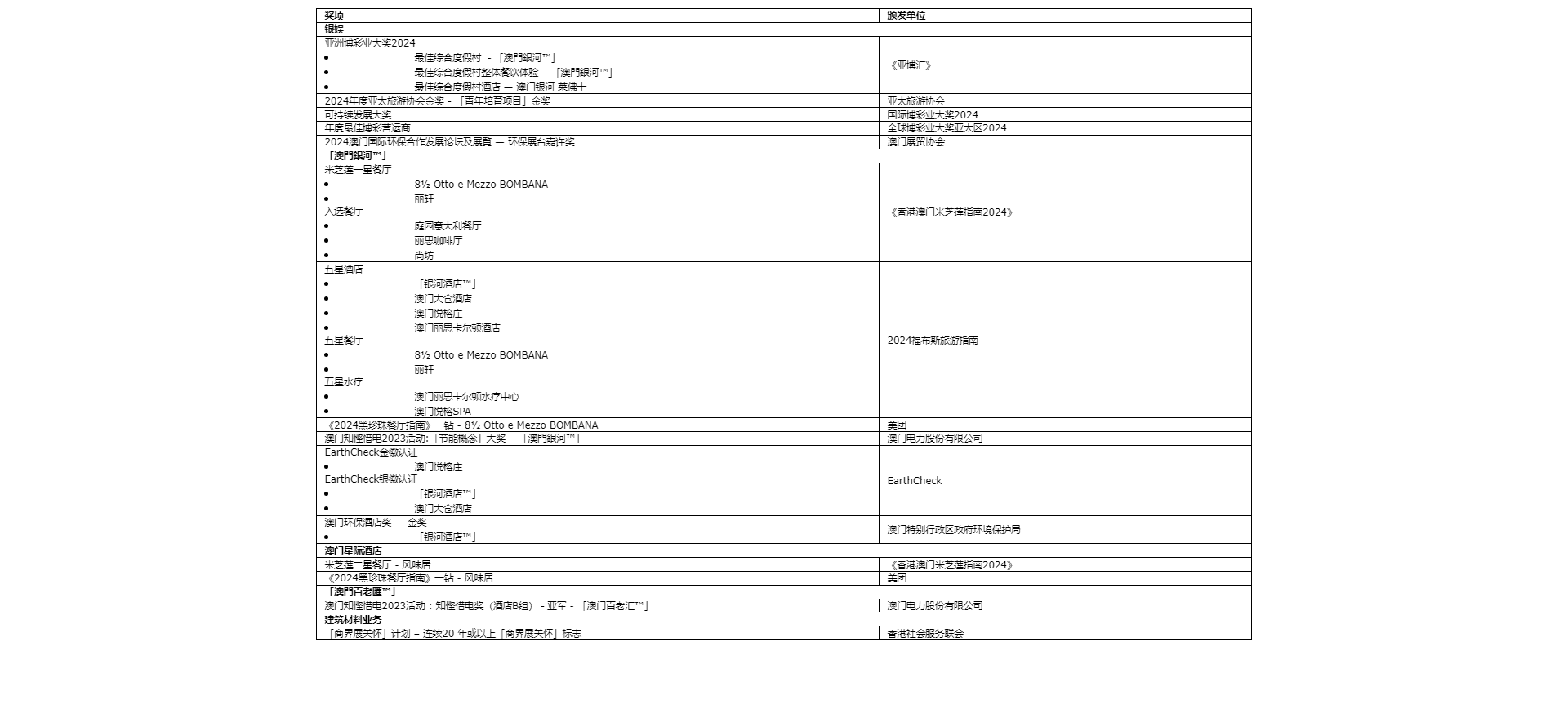 为丰富旅游产品,我们持续提升银河国际会议中心和银河综艺馆。在4月,银河综艺馆举办了2024年澳门国际乒联男子及女子世界杯。在国庆黄金周期间,香港著名歌手刘德华先生在银河综艺馆举办了多场演唱会,这带动了更多旅客使用我们度假城的设施,包括博彩、零售、餐饮和酒店。此外,我们已规划好在2024年第四季举办一系列的演出和娱乐活动,包括音乐会、脱口秀、歌剧和体育赛事,其中一项是UFC(终极格斗冠军赛)格斗之夜,我们相信将会非常受欢迎。