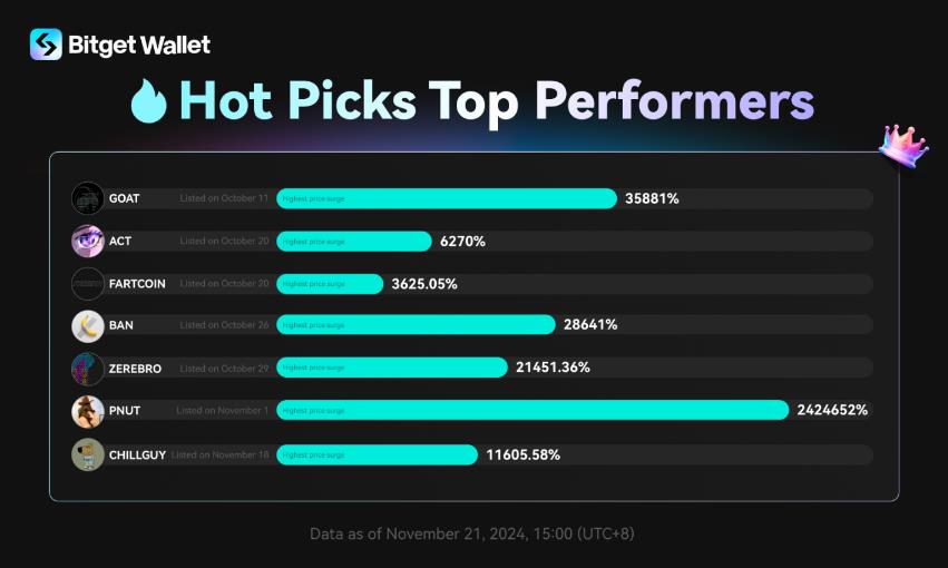 工具包的核心是MemeX和Hot Picks,这些强大的识别工具为迷因币生命周期的不同阶段量身定制。 MemeX 专注于超早期机会,识别市值低于100万美元的新发布代币,帮助交易者在这些项目获得关注之前捕捉到新兴机会。 Hot Picks 通过结合区块链数据、社交媒体趋势和智能资金信号,精选市值低于1000万美元的代币,重点关注具有重大增长潜力的代币。 在大量新项目涌现的情况下,这些功能共同对有潜力代币的发现过程进行了简化。 截至11月21日,Hot Picks 已识别出表现优异、实现大幅增长的迷因币:PNUT 涨幅达到 2424652%,BAN 涨幅28641%,GOAT 涨幅 35881%,ACT 涨幅 6270%,CHILLGUY 涨幅 11605.58%。